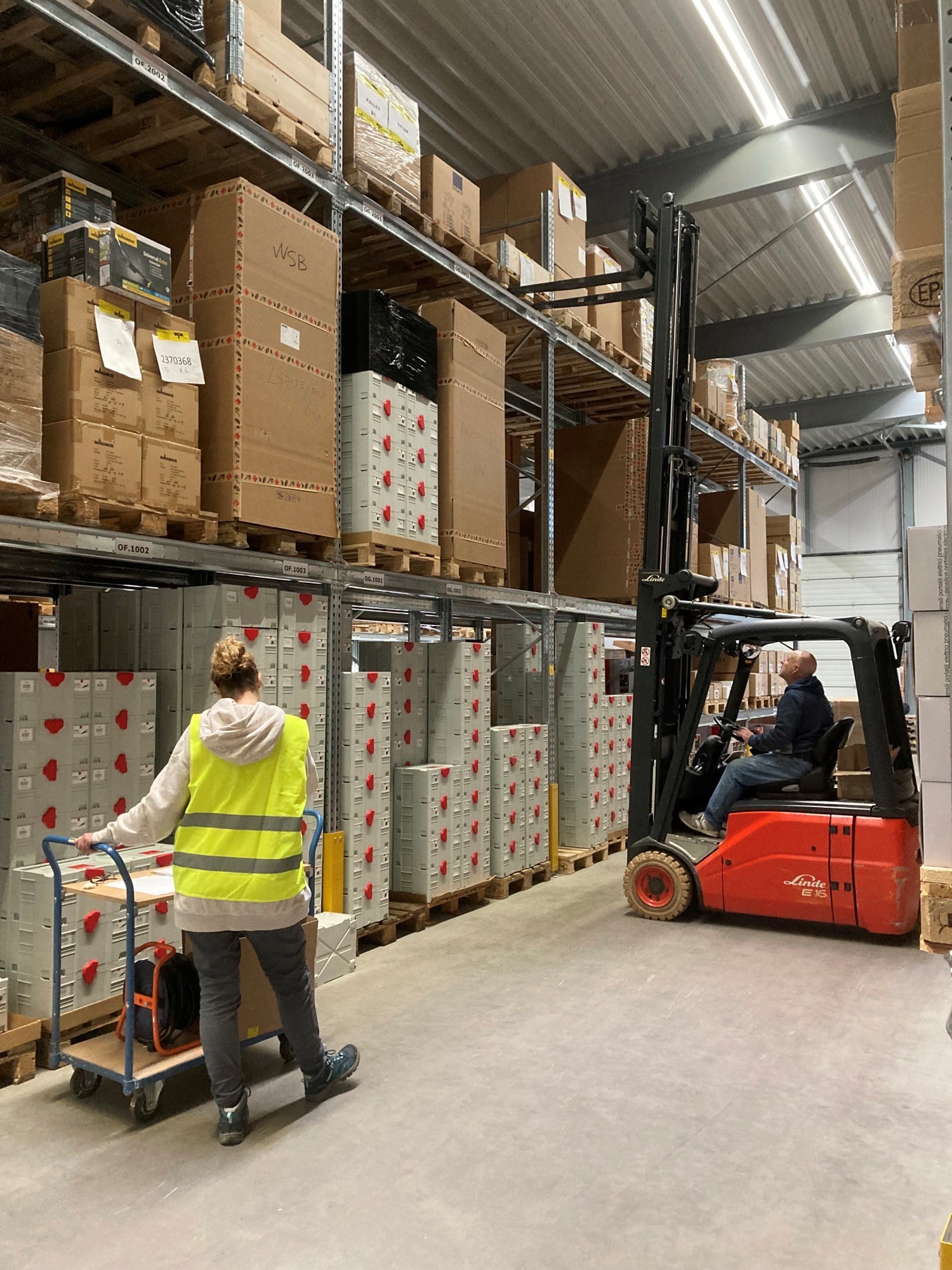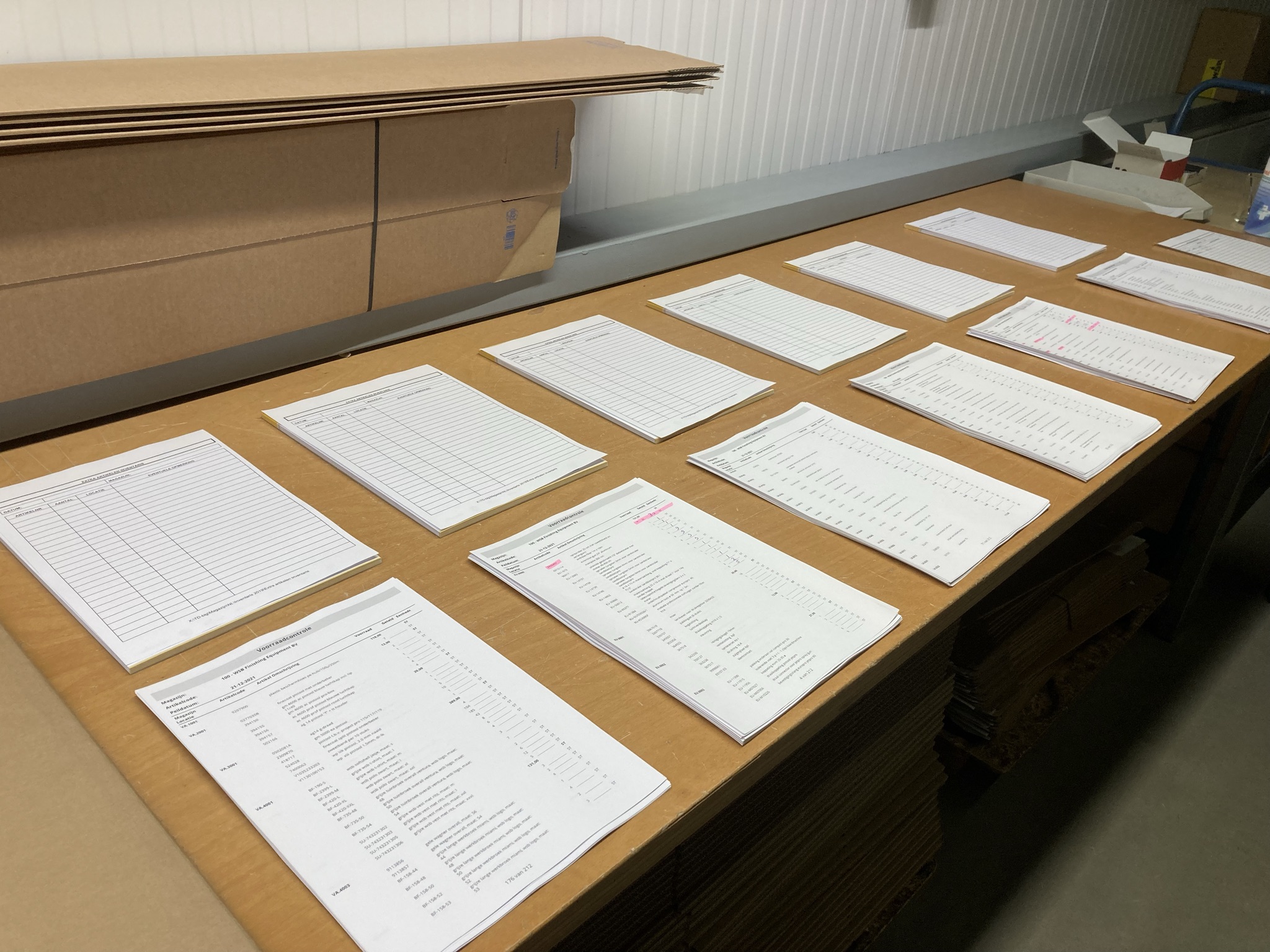 WSB bestaat al even. Met het tellen begonnen, vraag ik Danny hoe het vroeger eraan toe ging. ‘Oh, verschrikkelijk! Het lag bomvol, maar niets klopte.’ Met de jaren bracht Els met het magazijn en backoffice team daar verandering in. Het open magazijn werd afgetimmerd en een computergestuurd systeem werd aangebracht. Nu velen jaren later staan we in een net twee jaar oud hoofdmagazijn, waar de Grote Inventarisatie wordt uitgevoerd. ‘'t Gaat nu wel een héél stuk beter. Iain heeft het goed onder controle!’